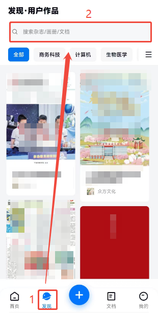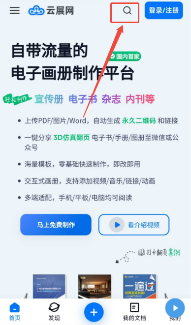 打開(kāi)云展網(wǎng)APP,點(diǎn)擊【發(fā)現(xiàn)】,上方搜索欄輸入關(guān)鍵詞搜索。