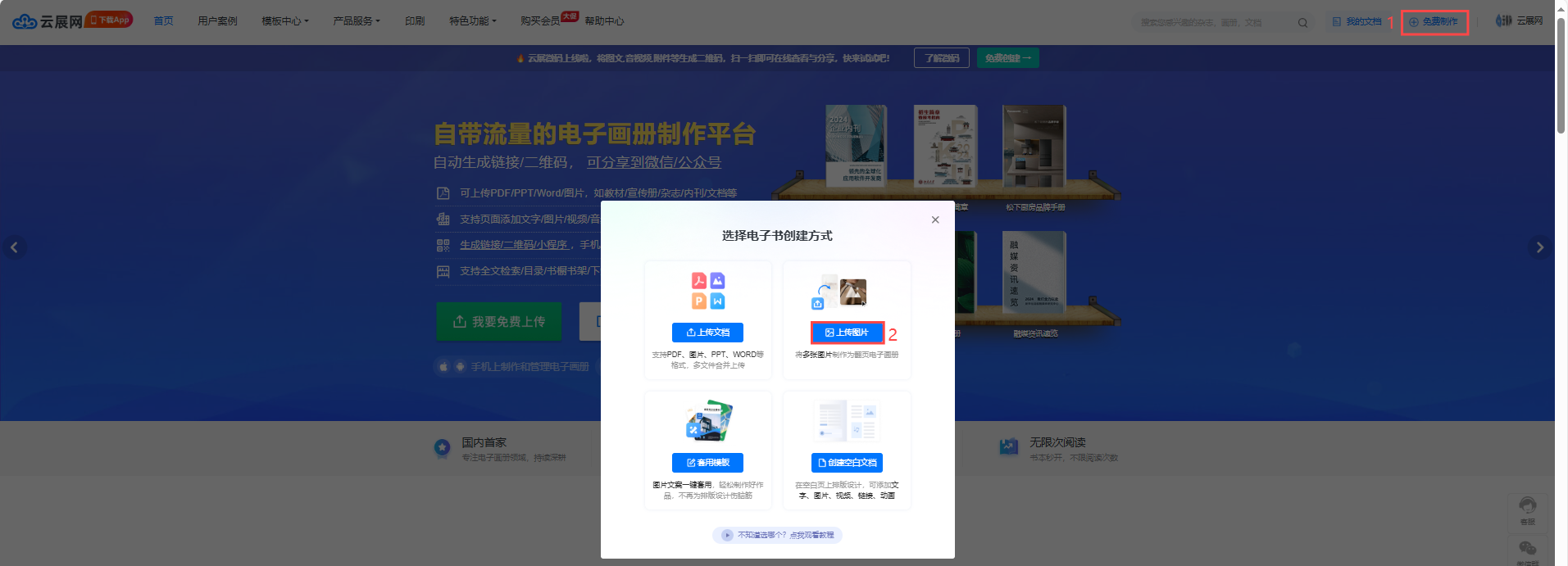 在云展網(wǎng)首頁的【免費制作】,點擊【上傳圖片】,拖拽圖片或點擊【單文件上傳】/【多文件合并上傳】上傳你需要上傳的圖片后,可拖動圖片以調(diào)整順序,并點擊【合并生成電子書】完成圖片上傳。