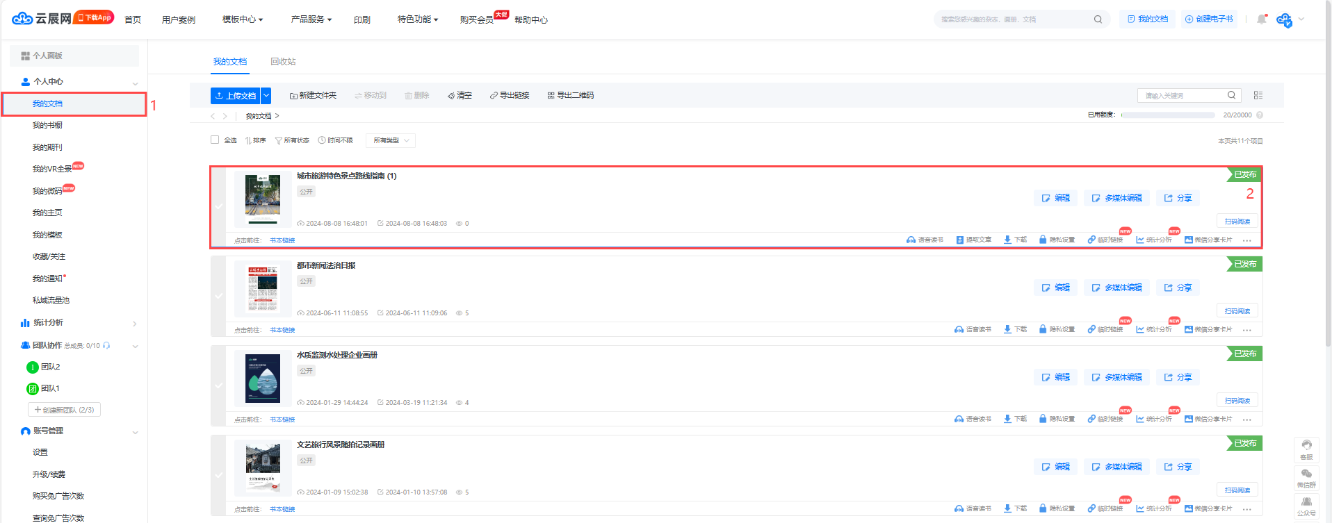 制作完成后的電子書將保存在【我的文檔】里,后續(xù)如果想重新編輯、管理的時候,可在【我的文檔】頁面對電子書進行編輯、復制、刪除、設(shè)置等操作。
