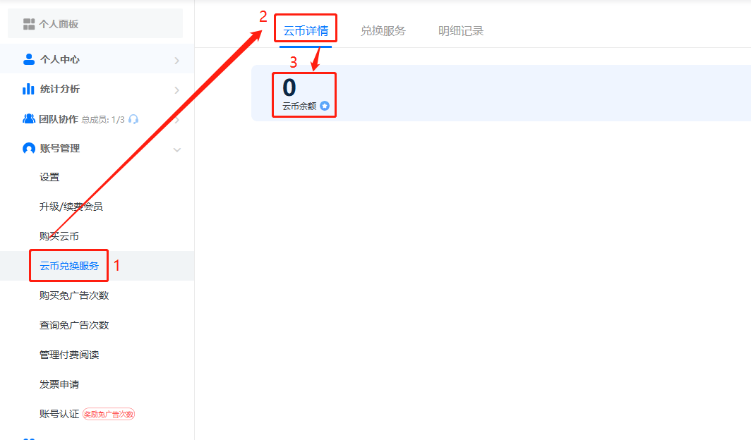 點擊【云幣兌換服務】,再點擊【云幣詳情】,即可查看當前云幣余額。