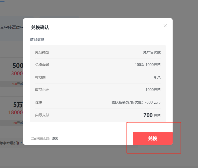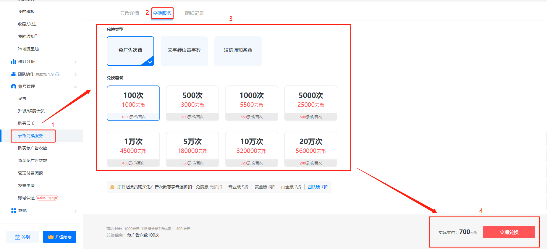 點擊【云幣兌換服務】,再點擊【兌換服務】,選擇需要的類型和套餐,然后右下方點擊立即兌換,最后點擊彈出的詳情框的兌換即可。
