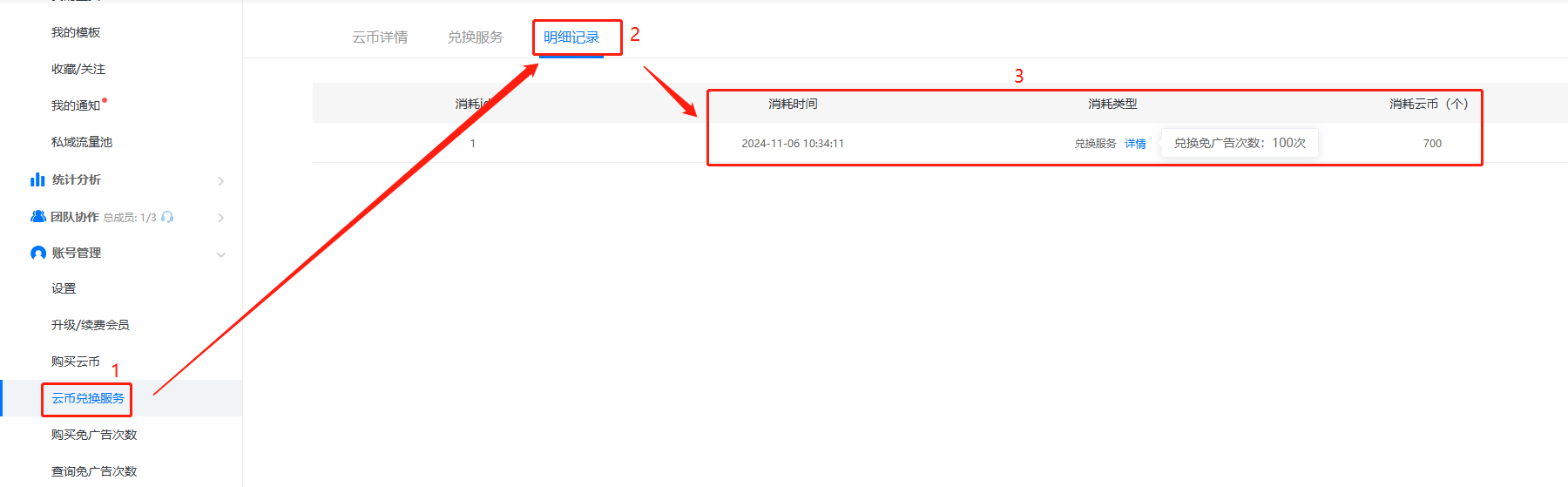 點擊【云幣兌換服務】,再點擊【明細記錄】,即可查看云幣兌換明細。