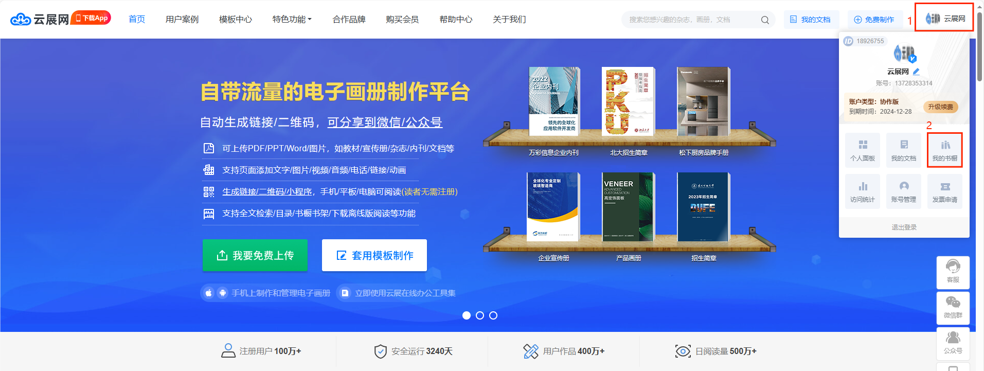 將鼠標懸停在云展網(wǎng)首頁右上角我的賬號上,點擊【我的書櫥】進入界面。