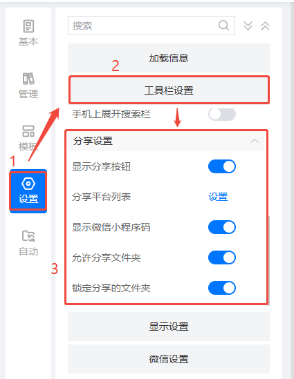 點擊【設置】中的【工具欄設置】,下劃找到【分享設置】,根據(jù)自己的需要進行設置。