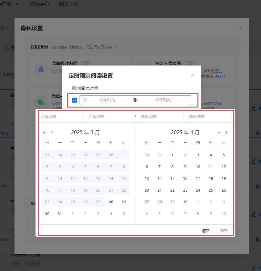 設(shè)置開啟日期時(shí)間和結(jié)束日期時(shí)間,在設(shè)置的這段時(shí)間內(nèi),書本無法閱讀。