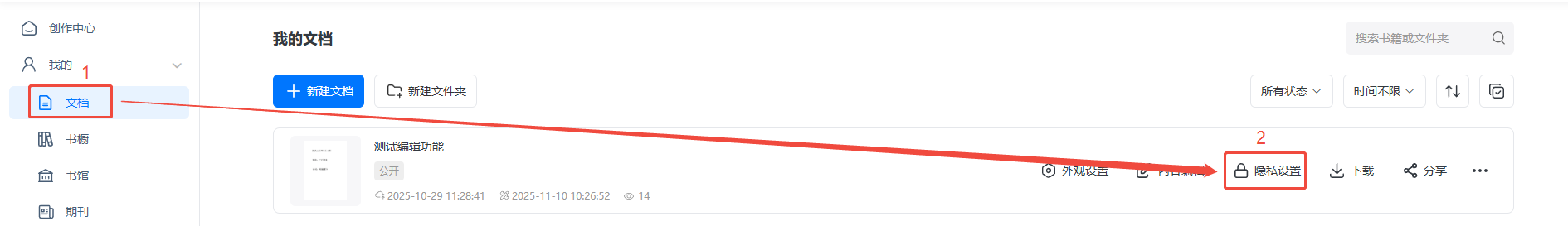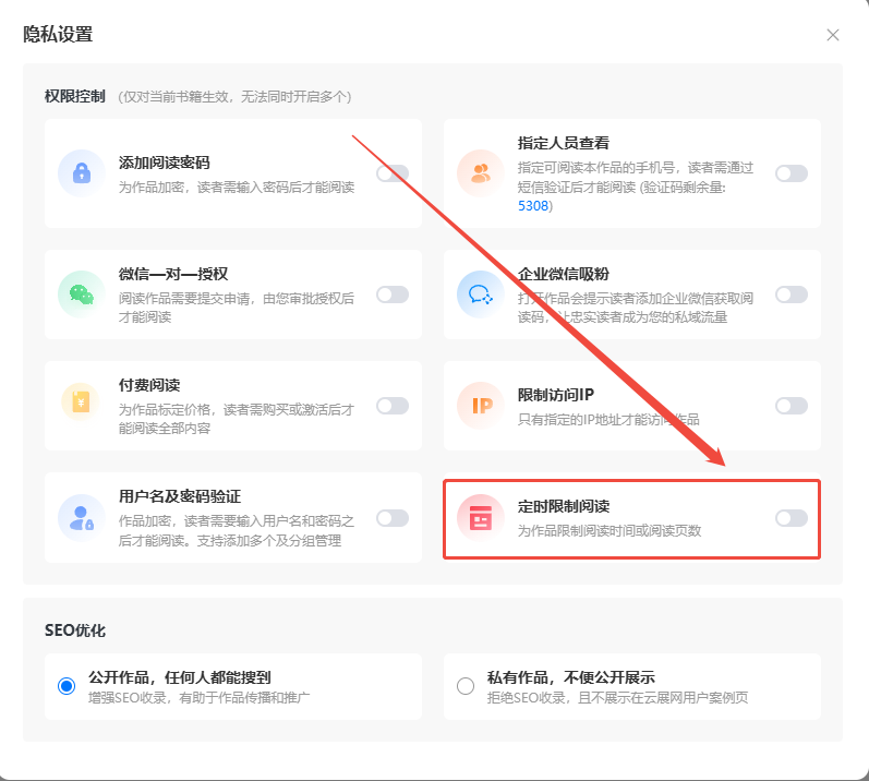 點(diǎn)擊【文檔】,找到電子畫冊(cè)再點(diǎn)擊【隱私設(shè)置】,開啟【定時(shí)限制閱讀】。