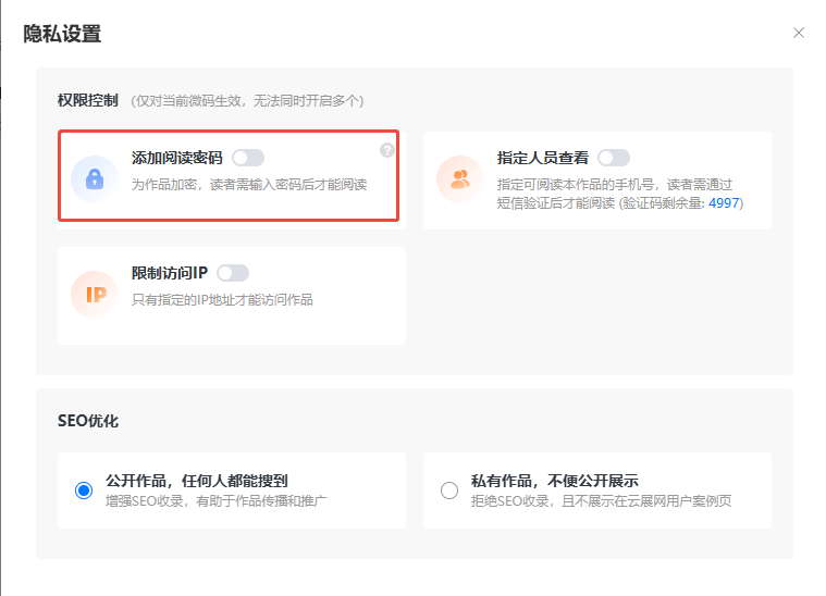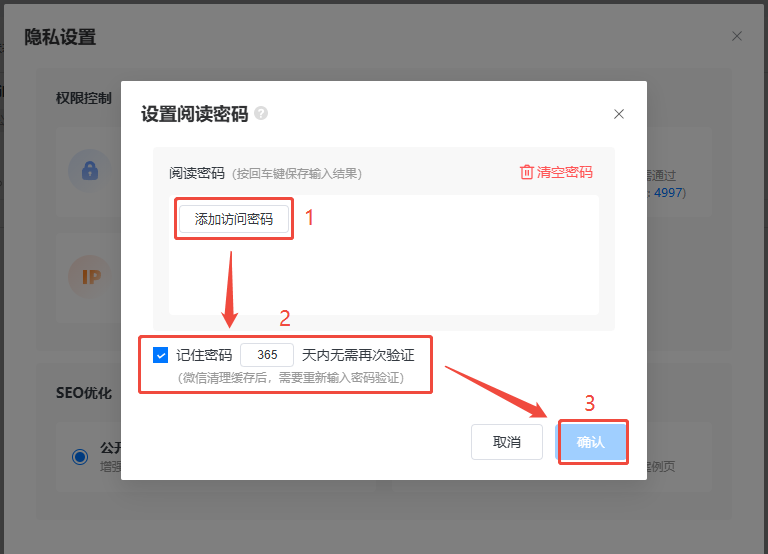 點(diǎn)擊【訪問密碼】輸入一個或者多個密碼,如果您希望讀者在設(shè)定的時間段內(nèi)再次訪問時無需重新輸入密碼驗證,還可以選擇勾選下方的【記住密碼】,并設(shè)置密碼間隔時間,最后點(diǎn)擊【確認(rèn)】。