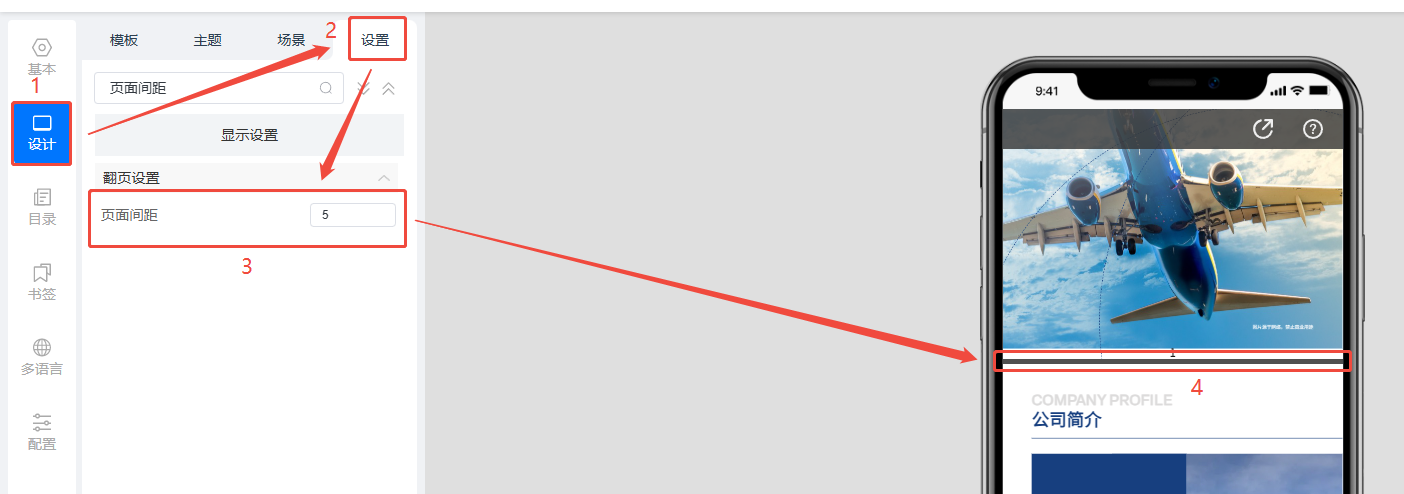 點(diǎn)擊【設(shè)計(jì)】,然后點(diǎn)擊【設(shè)置】,設(shè)置【頁(yè)面間距】,頁(yè)面間距就是兩頁(yè)之間的距離,建議設(shè)置為【5】。