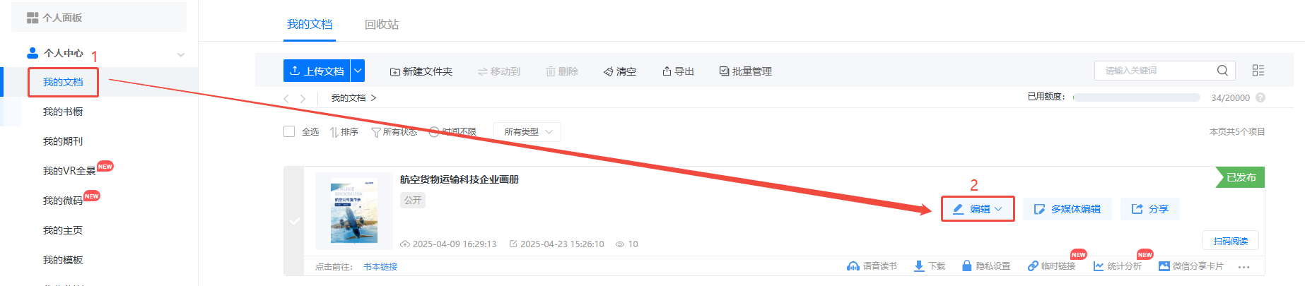 點(diǎn)擊【我的文檔】,找到對(duì)應(yīng)的電子畫(huà)冊(cè),點(diǎn)擊【編輯】,打開(kāi)編輯界面。