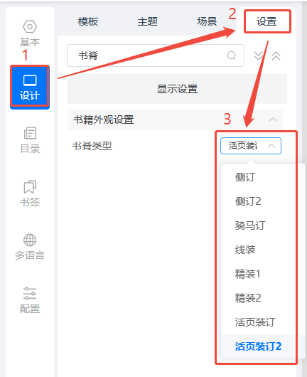 點(diǎn)擊【設(shè)計(jì)】,然后點(diǎn)擊【設(shè)置】,【書(shū)脊類型】選一個(gè)自己喜歡的。