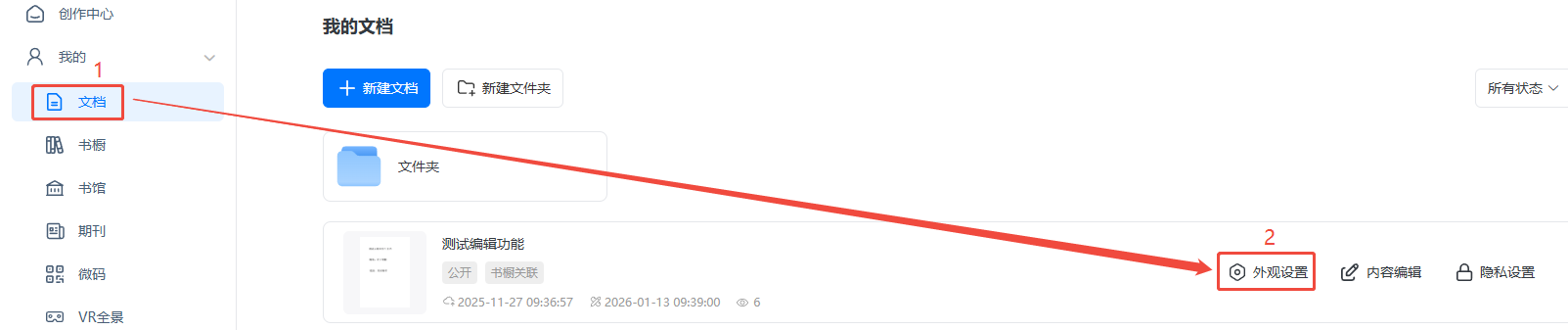 點擊【文檔】,找到對應(yīng)的電子畫冊,點擊【外觀設(shè)置】。