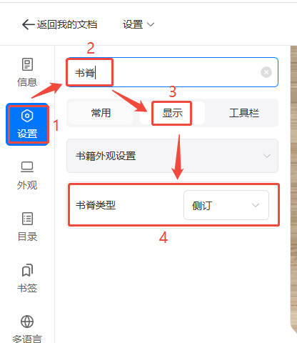 點擊【設(shè)置】,上方搜索【書脊】,然后點擊【顯示】,在【書脊類型】選擇一個想要的即可自動保存。