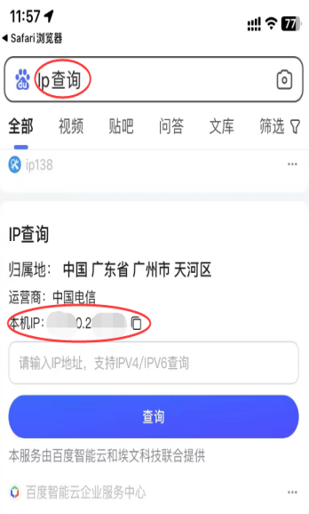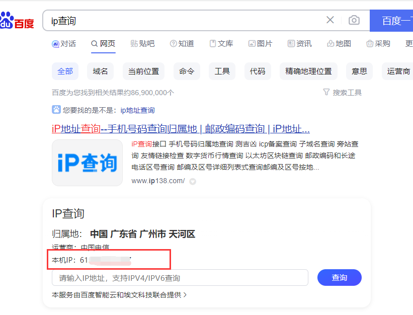 在電腦或者手機的瀏覽器上搜索【IP查詢】就可以獲取當前的網(wǎng)絡(luò)IP地址。