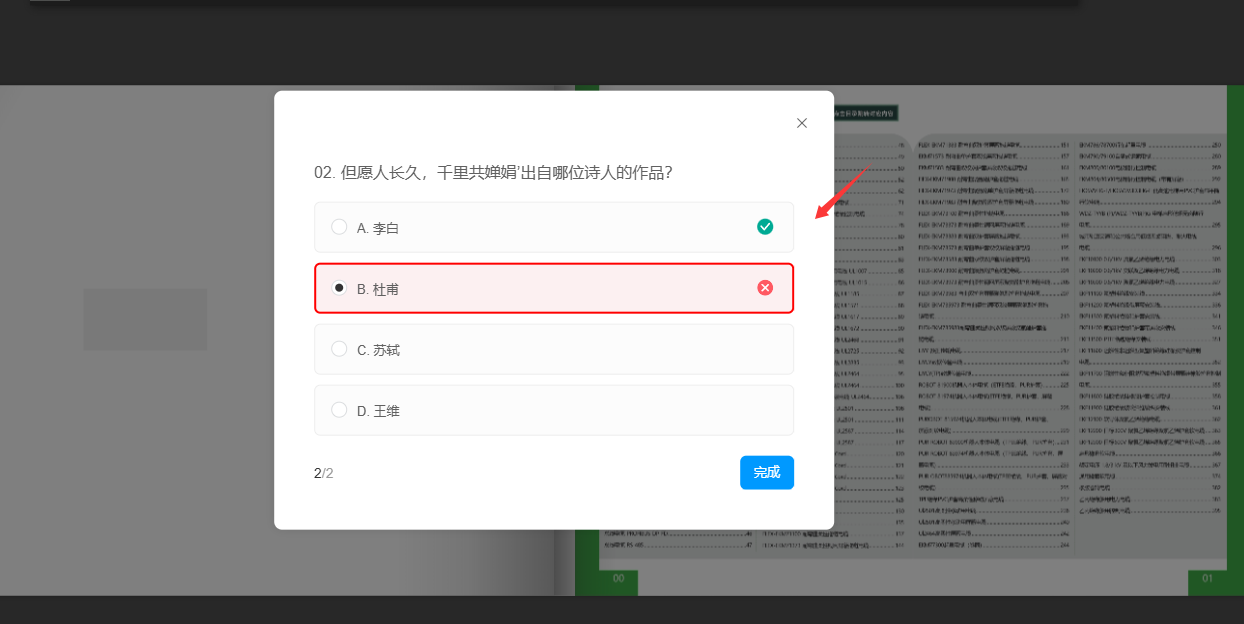 此功能適用于電子教科書和電子教輔書,可以在書中的文字或者圖片添加超鏈接,點擊彈出選擇題題目,給讀者進行答題測驗,讀者提交答案后可即時獲得”正確”或”錯誤”的反饋。