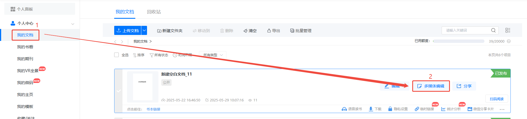 點進【我的文檔】/【文檔】,選擇對應電子書,點擊【多媒體編輯】/【內(nèi)容編輯】。