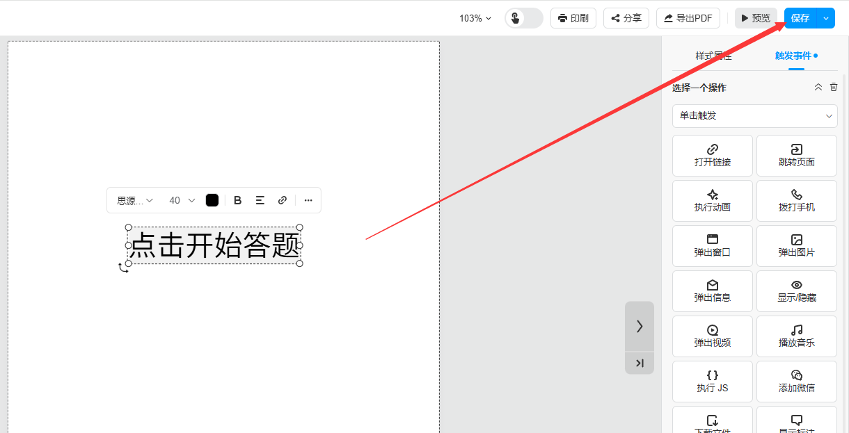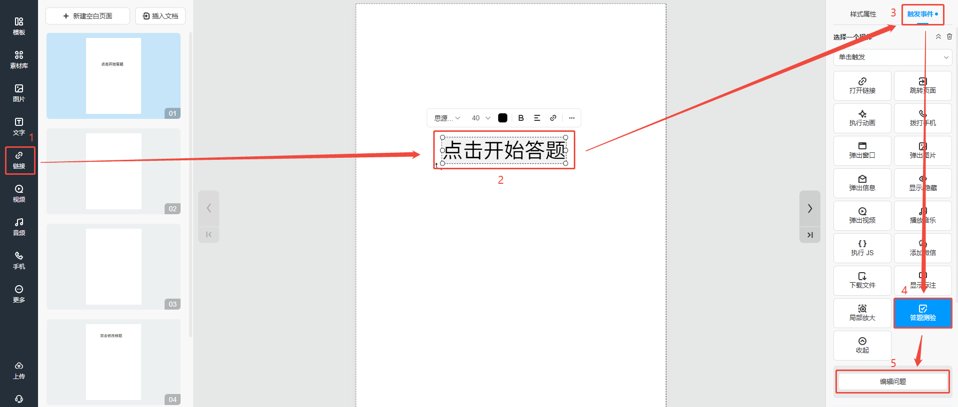 點擊【鏈接】,將出現(xiàn)在頁面上超鏈接放置到文字或者圖片上,點擊右上角【觸發(fā)事件】,選擇【答題測驗】,點擊【編輯問題】。