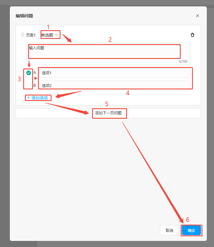 在【單選題】選擇題目為單選題或者多選題,下方輸入問題題目,勾選其中一個選項為正確答案(如果是多選題可勾選多個),右側(cè)編輯選項,如果想要增加多個選項,可以點擊【+添加選項】增加,如果需要添加多個問題,可以點擊【添加下一頁問題】,全都編輯好之后點擊【確定】。