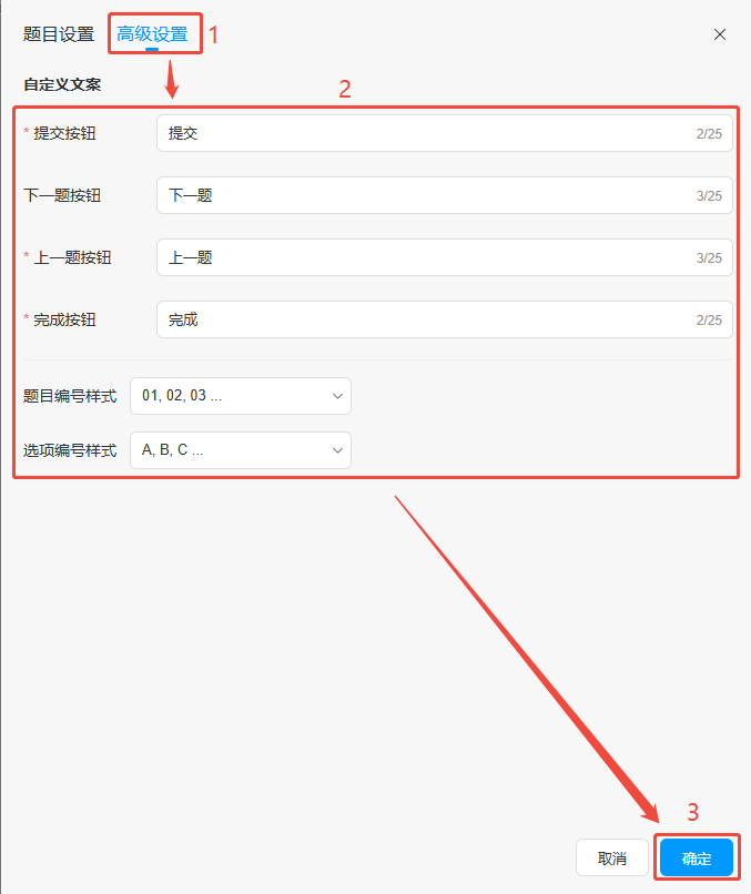 點擊【高級設(shè)置】,下方設(shè)置按鈕名稱,以及題目編號樣式和選項編號樣式,最后點擊右下角【確定】即可。