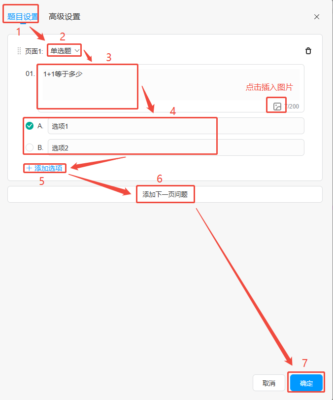 點擊【題目設(shè)置】,在【單選題】選擇題目為單選題或者多選題,下方輸入問題題目,勾選其中一個選項為正確答案(如果是多選題可勾選多個),右側(cè)編輯選項內(nèi)容。