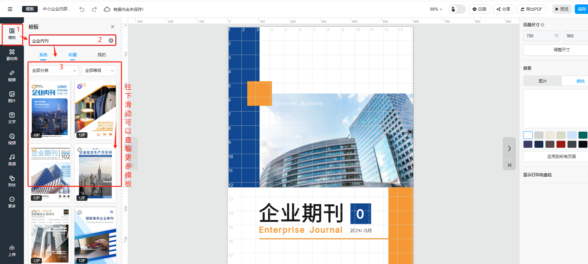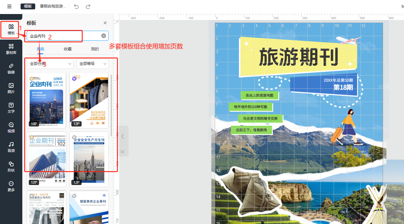 (1)在編輯器頁面,點擊左邊的【模板】,輸入關(guān)鍵字搜索后,往下滑動可以瀏覽更多模板