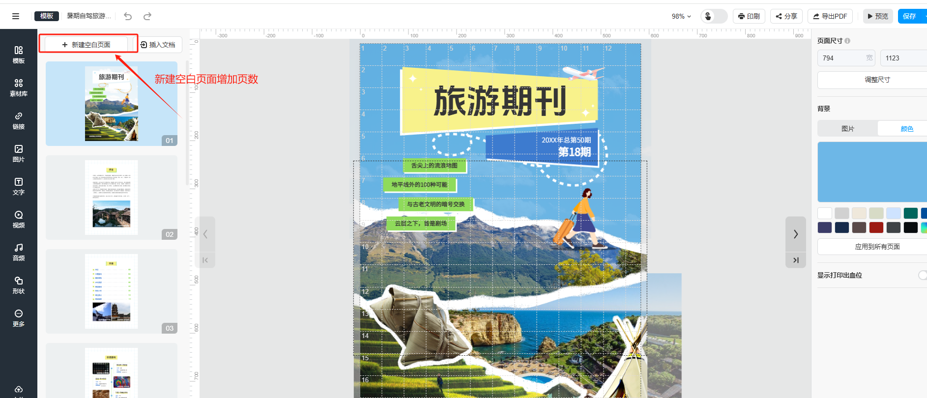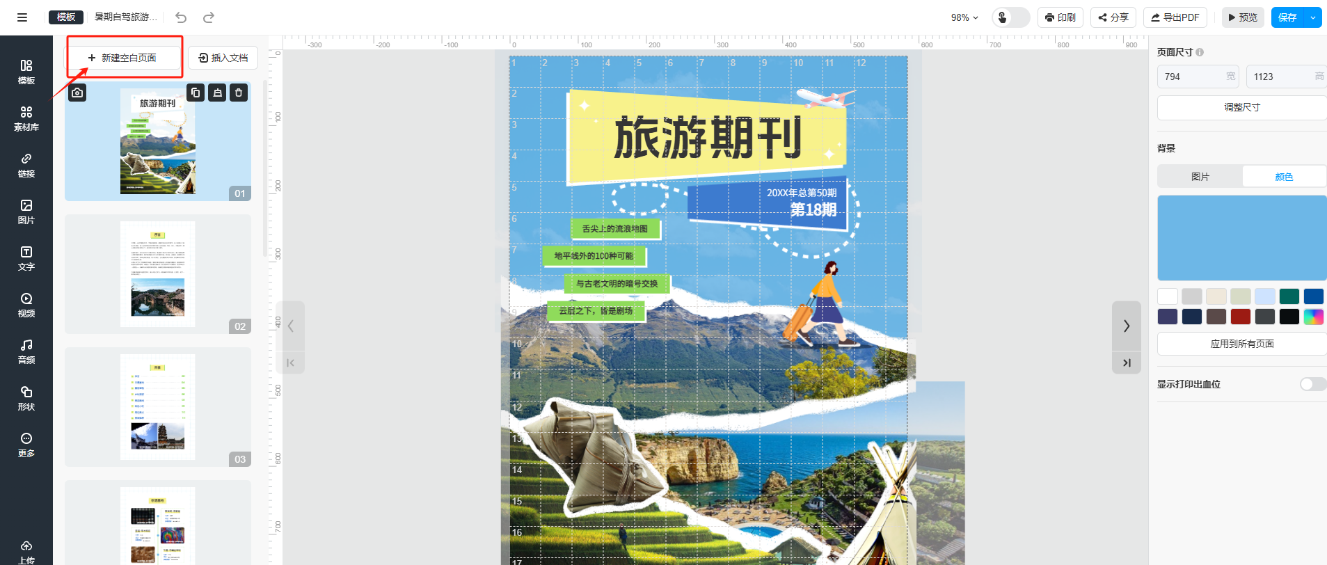 (2)進入編輯器頁面后,點擊【新建空白頁面】,新增一頁空白頁可以自由編輯
