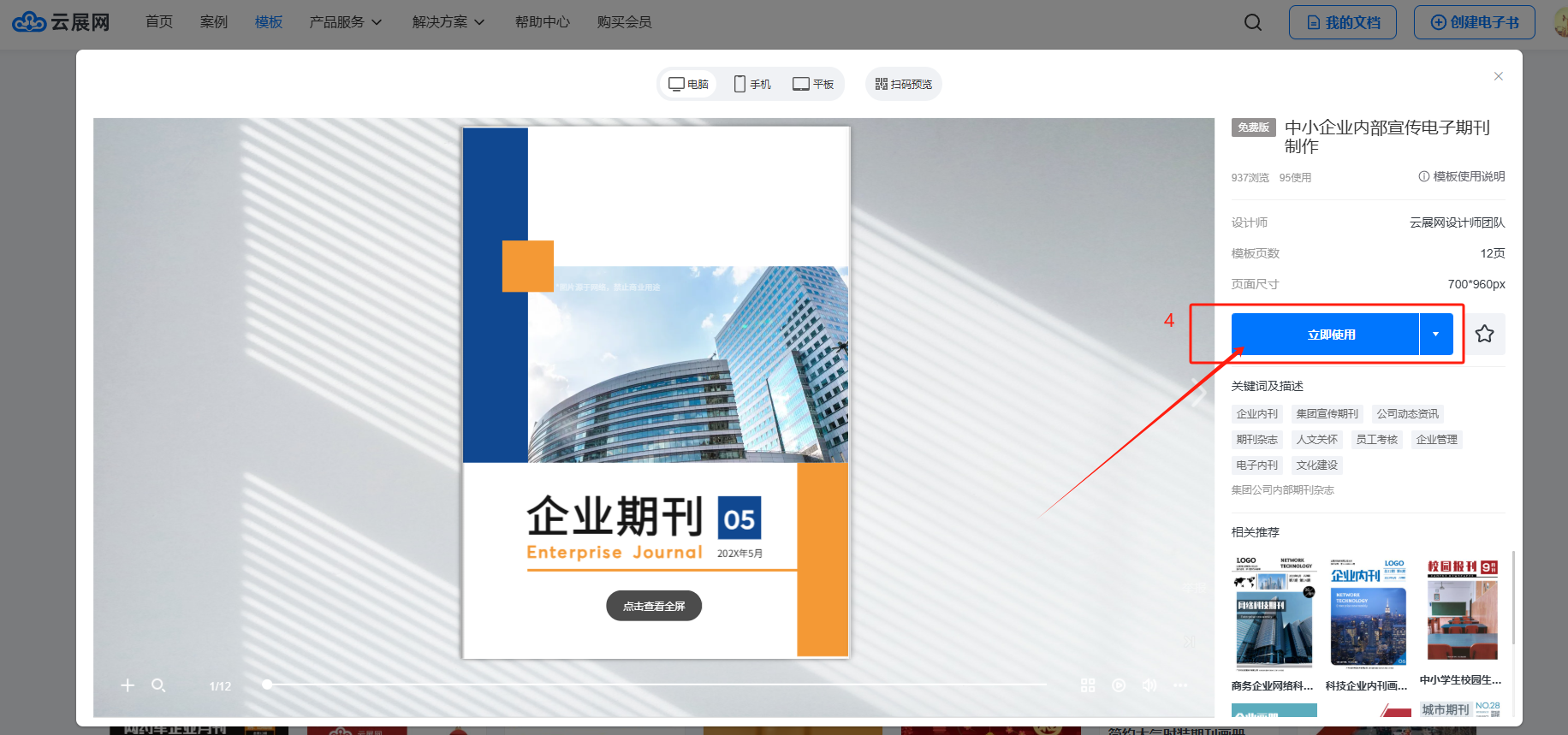 (1)在【模板】頁面,檢索關(guān)鍵詞選擇一款心儀的模板,點擊【立即使用】