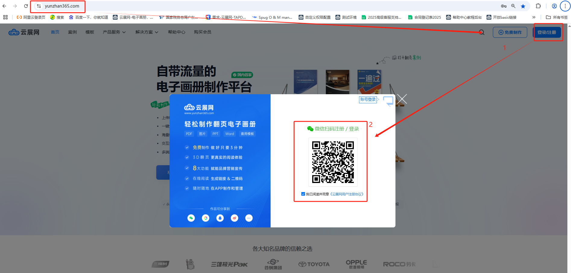 在電腦上打開(kāi)瀏覽器,輸入網(wǎng)址http://m.hgdzy.com/打開(kāi)云展網(wǎng),然后點(diǎn)擊右上角的【登錄/注冊(cè)】按鈕,用微信掃描二維碼登錄