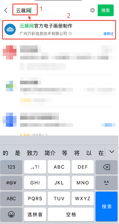 (2)上方搜索欄輸入【云展網(wǎng)】,會出現(xiàn)云展網(wǎng)的小程序,點(diǎn)擊進(jìn)入。