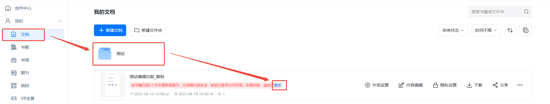 為進(jìn)一步保障內(nèi)容安全,免費(fèi)用戶的書籍若連續(xù)三個(gè)月內(nèi)無任何編輯、修改等更新操作,或者付費(fèi)會員會員資格到期滿三個(gè)月起,系統(tǒng)將對書籍進(jìn)行暫時(shí)停止訪問處理,用戶登錄賬戶并完成激活操作后,可立即恢復(fù)書籍的正常訪問權(quán)限。