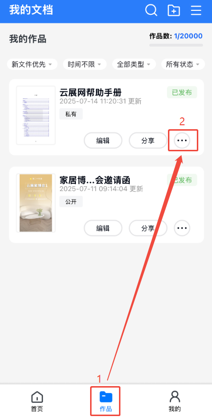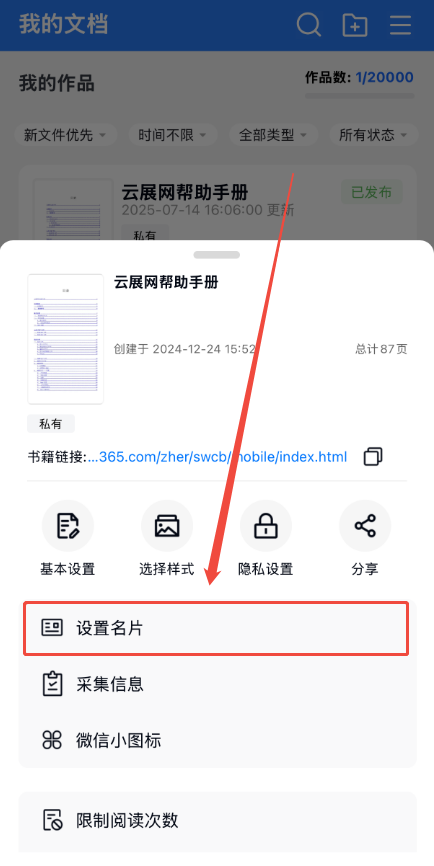 點(diǎn)擊【作品】,點(diǎn)擊對應(yīng)電子書右邊三個(gè)點(diǎn),然后點(diǎn)擊【設(shè)置名片】打開名片設(shè)置界面。