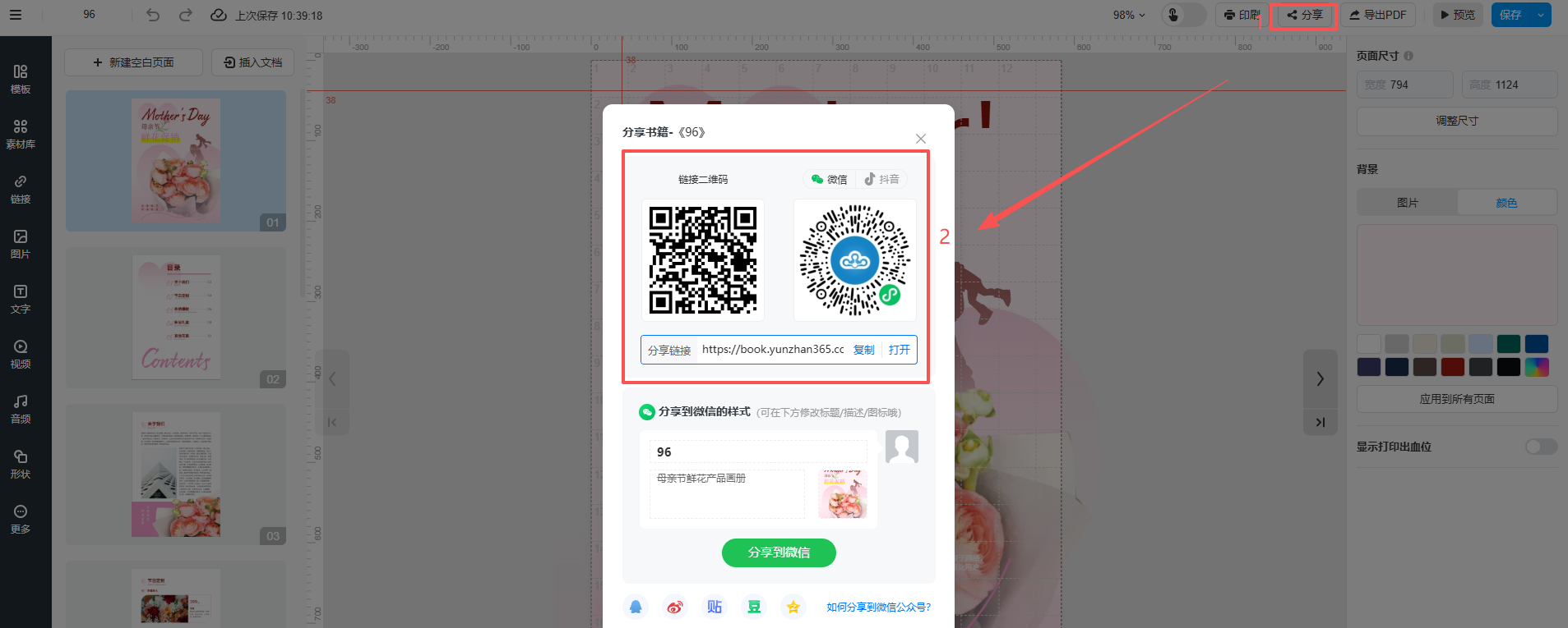 書(shū)籍制作好后保存,點(diǎn)擊右上角的【分享】/【導(dǎo)出PDF】,即可分享書(shū)籍和導(dǎo)出pdf格式。