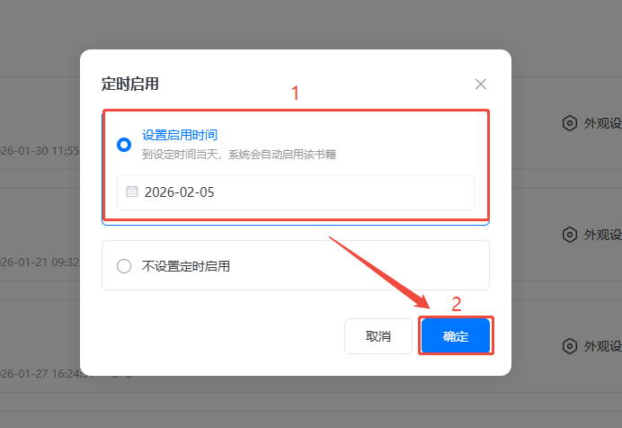 選擇【設(shè)置啟用時間】,設(shè)定啟用日期為零點,系統(tǒng)將自動啟用該書籍,比如設(shè)置1月31日啟用,即書本會在1月31日00:00時啟用(略有幾分鐘延遲屬正常情況)。
