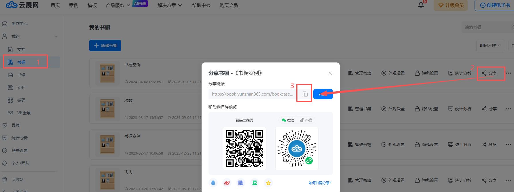 點擊【書櫥】,點擊【分享】后復(fù)制書櫥鏈接。如這個書櫥鏈接為:https://baijingtest.sharedbook.cn/bookcase/qbba/index.html
