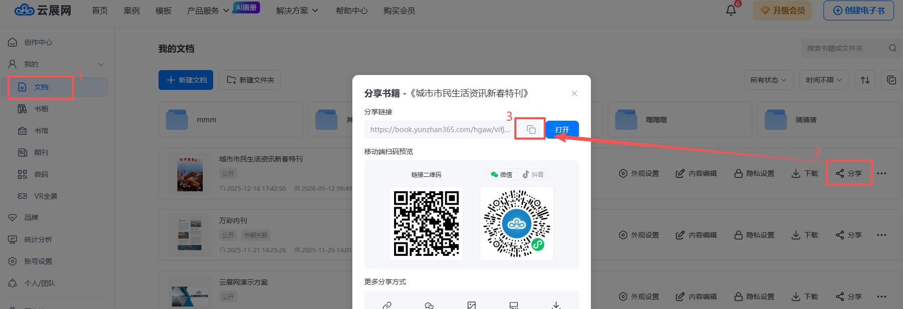 點擊【文檔】,點擊【分享】后復(fù)制書本鏈接,如這本書的鏈接為https://book.yunzhan365.com/kykh/tppo/mobile/index.html