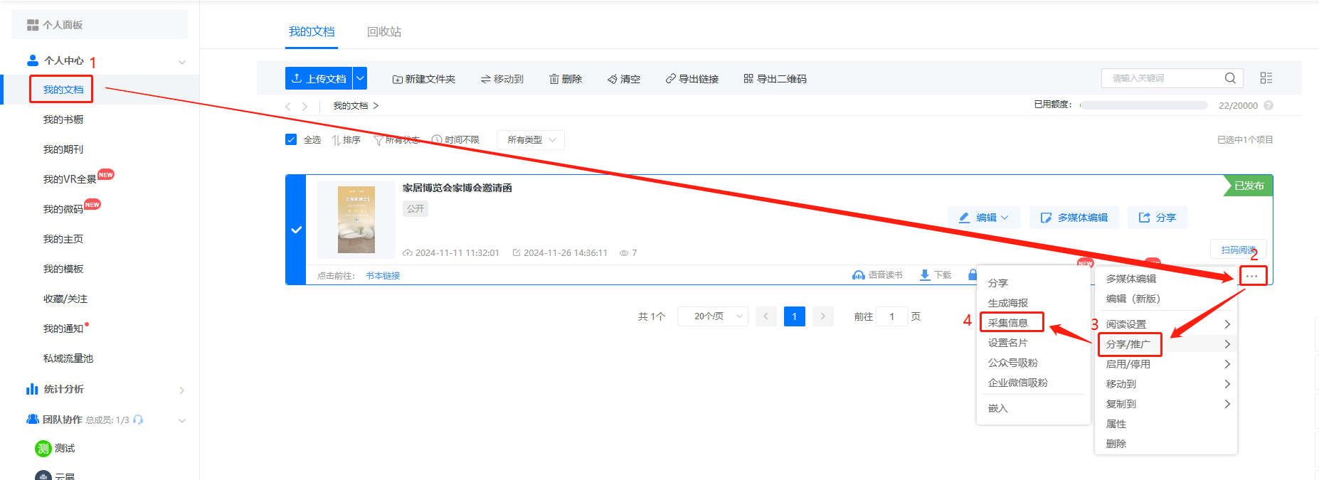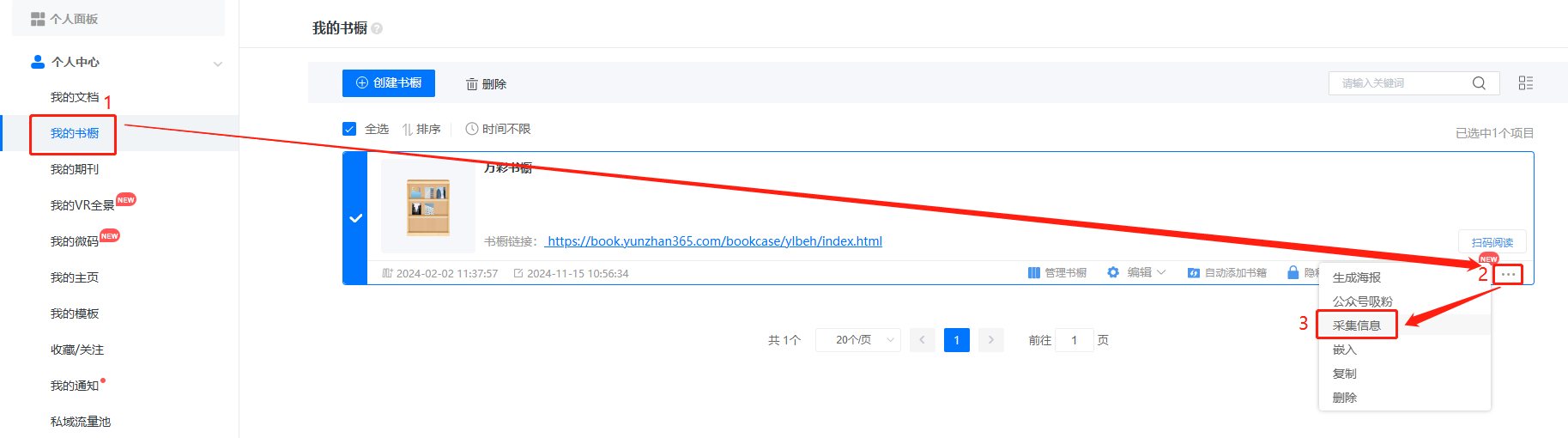 點(diǎn)擊【我的文檔】/【我的書櫥】,找到書本/書櫥,點(diǎn)擊右下角三個(gè)點(diǎn),點(diǎn)擊【采集信息】。