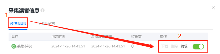 采集的數(shù)據(jù)是實(shí)時(shí)的,可以根據(jù)操作步驟的第一步打開采集讀者信息,點(diǎn)擊【讀者信息】查看采集到的數(shù)據(jù),支持下載數(shù)據(jù),刪除或者暫停采集任務(wù)。