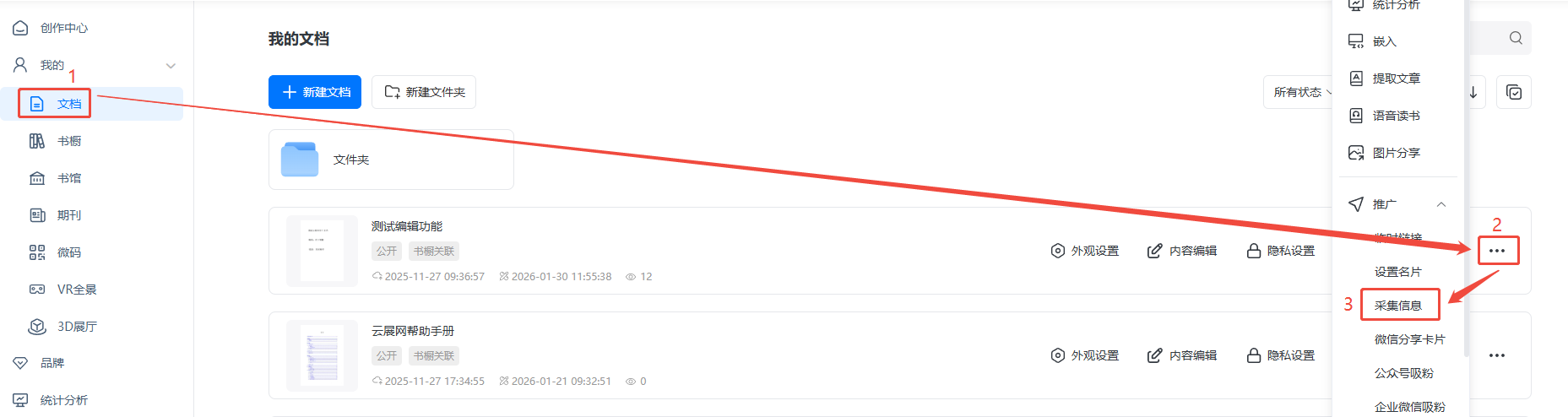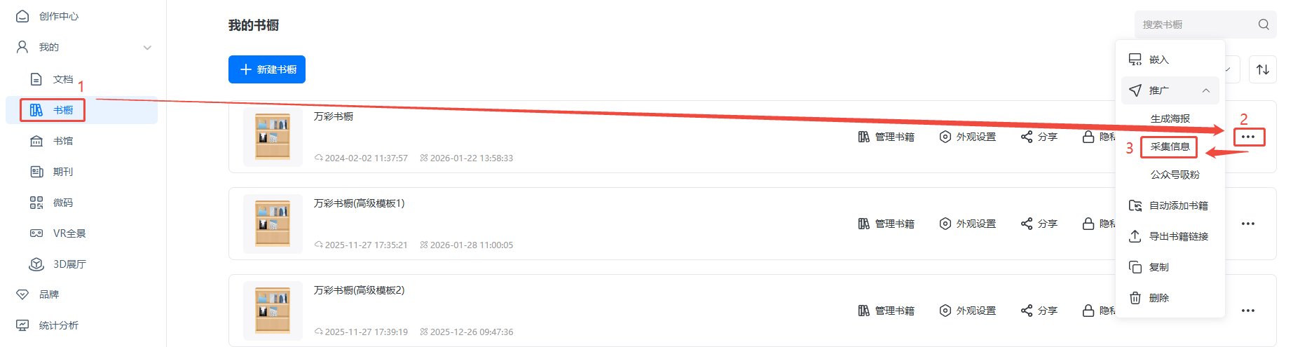 點(diǎn)擊【文檔】/【書(shū)櫥】,找到書(shū)本/書(shū)櫥,點(diǎn)擊右邊三個(gè)點(diǎn),點(diǎn)擊【采集信息】。
