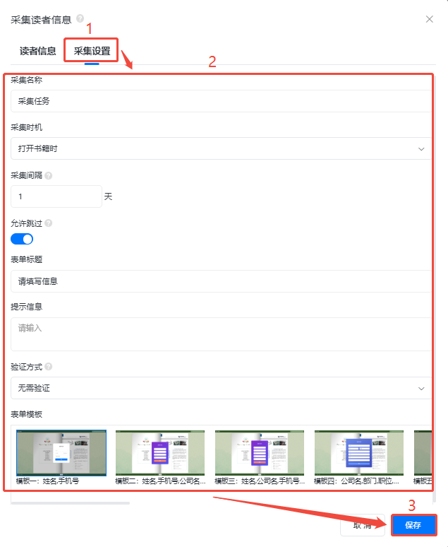 為了提高作者跟讀者之間的互動(dòng)溝通,我們開(kāi)發(fā)了采集信息功能,通過(guò)應(yīng)用不同模板,您可以要求讀者填寫(xiě)他的名字,手機(jī)號(hào),微信號(hào)等才能繼續(xù)閱讀書(shū)本/書(shū)櫥,不僅可以獲取潛在有意向的客戶數(shù)據(jù),還可以提高您與讀者之間的交互。