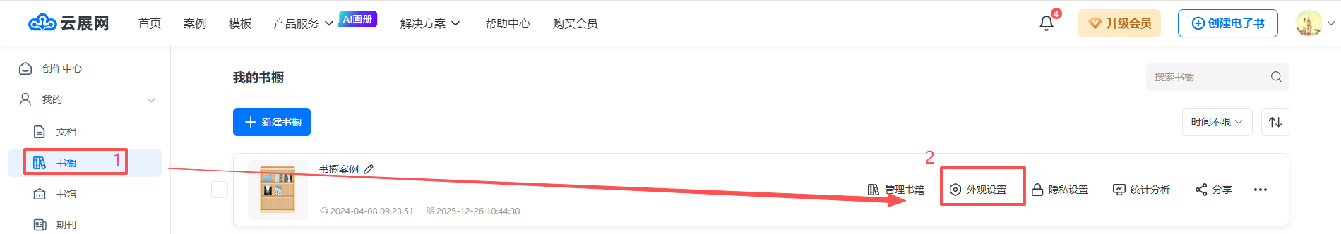 點(diǎn)擊【書櫥】,找到對(duì)應(yīng)書櫥,點(diǎn)擊【外觀設(shè)置】,進(jìn)入編輯界面。