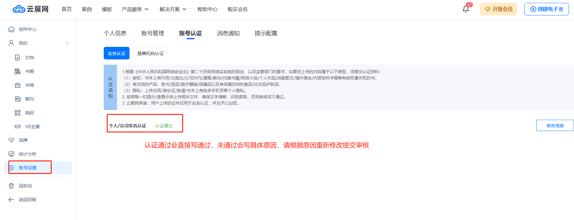 審核員都會審核您上傳的書本,如果要求您認證的話,登錄云展網(wǎng)后臺會有認證提示,您要在15天內(nèi)完成認證通過,否則書本會暫停訪問。你提交資料以后,我們會在1個工作日內(nèi)審核,審核結果可以在這里查看。