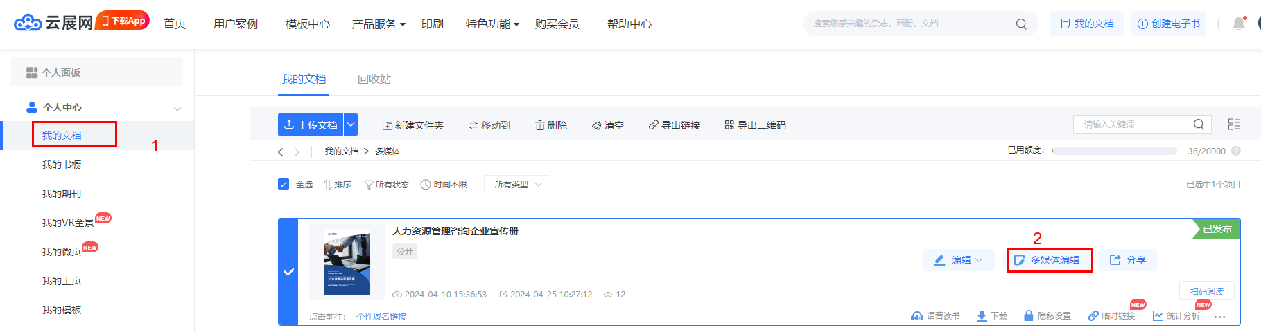點(diǎn)進(jìn)【我的文檔】/【文檔】,選擇對(duì)應(yīng)電子書,點(diǎn)擊【多媒體編輯】/【內(nèi)容編輯】。