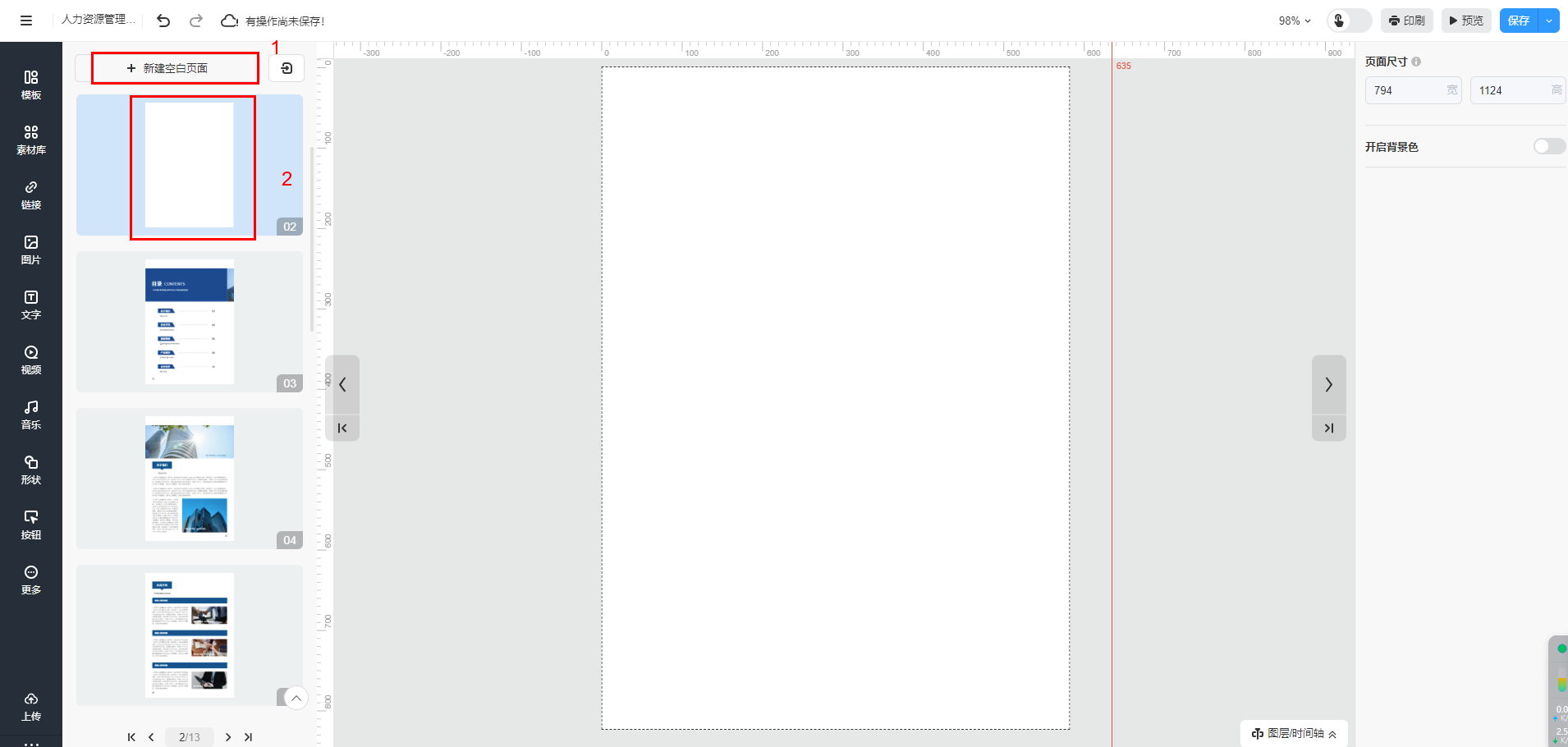 操作:點(diǎn)擊【新建空白頁面】,新增的頁面會(huì)默認(rèn)顯示在你原先選中的頁面下方。