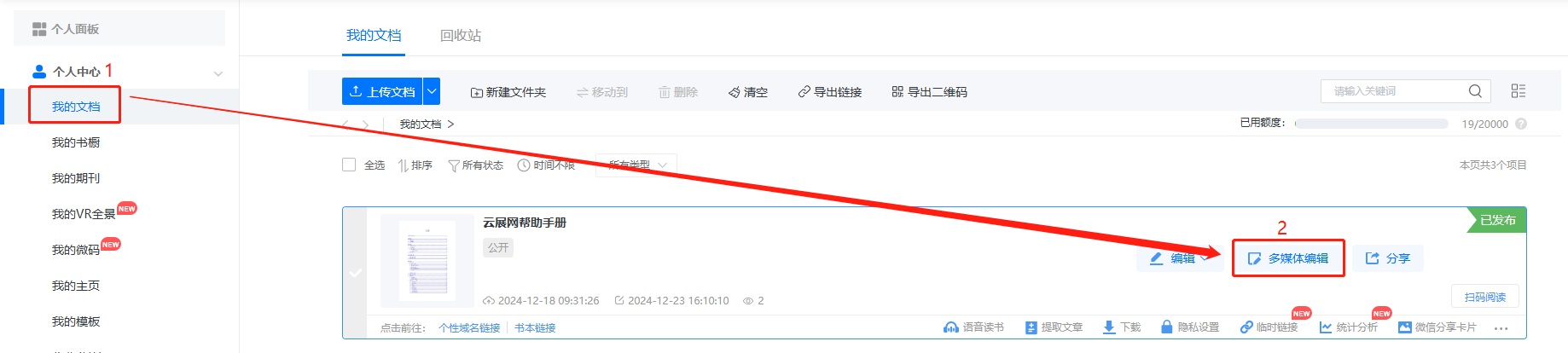 點(diǎn)進(jìn)【我的文檔】/【文檔】,選擇對應(yīng)電子書,點(diǎn)擊【多媒體編輯】/【內(nèi)容編輯】。