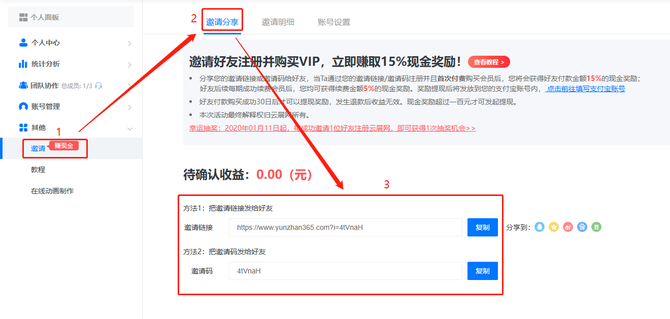 如何用云展網(wǎng)邀請(qǐng)好友購買會(huì)員賺現(xiàn)金獎(jiǎng)勵(lì)?只需要分享您的邀請(qǐng)鏈接或邀請(qǐng)碼給好友,當(dāng)好友通過您的邀請(qǐng)鏈接或者邀請(qǐng)碼注冊,并且購買付費(fèi)會(huì)員后,您將獲得相應(yīng)的現(xiàn)金獎(jiǎng)勵(lì)。