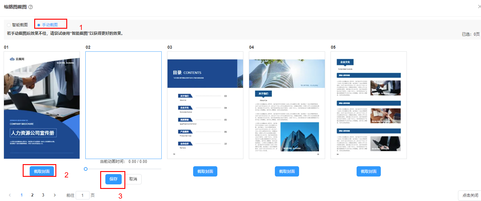 選擇【手動截圖】,點(diǎn)擊每張頁面下方的【截取封面】,并點(diǎn)擊保存,即可完成截圖。