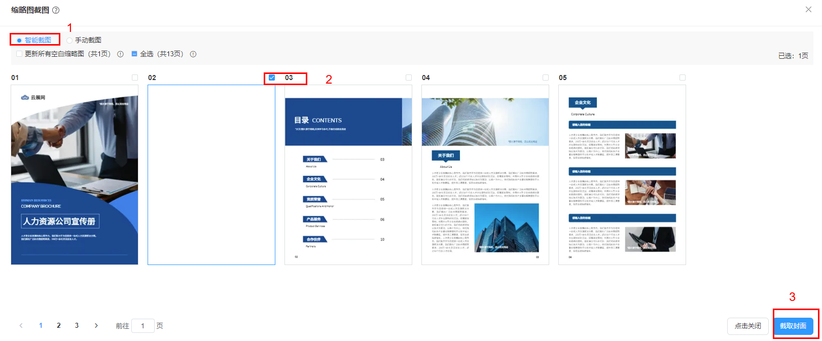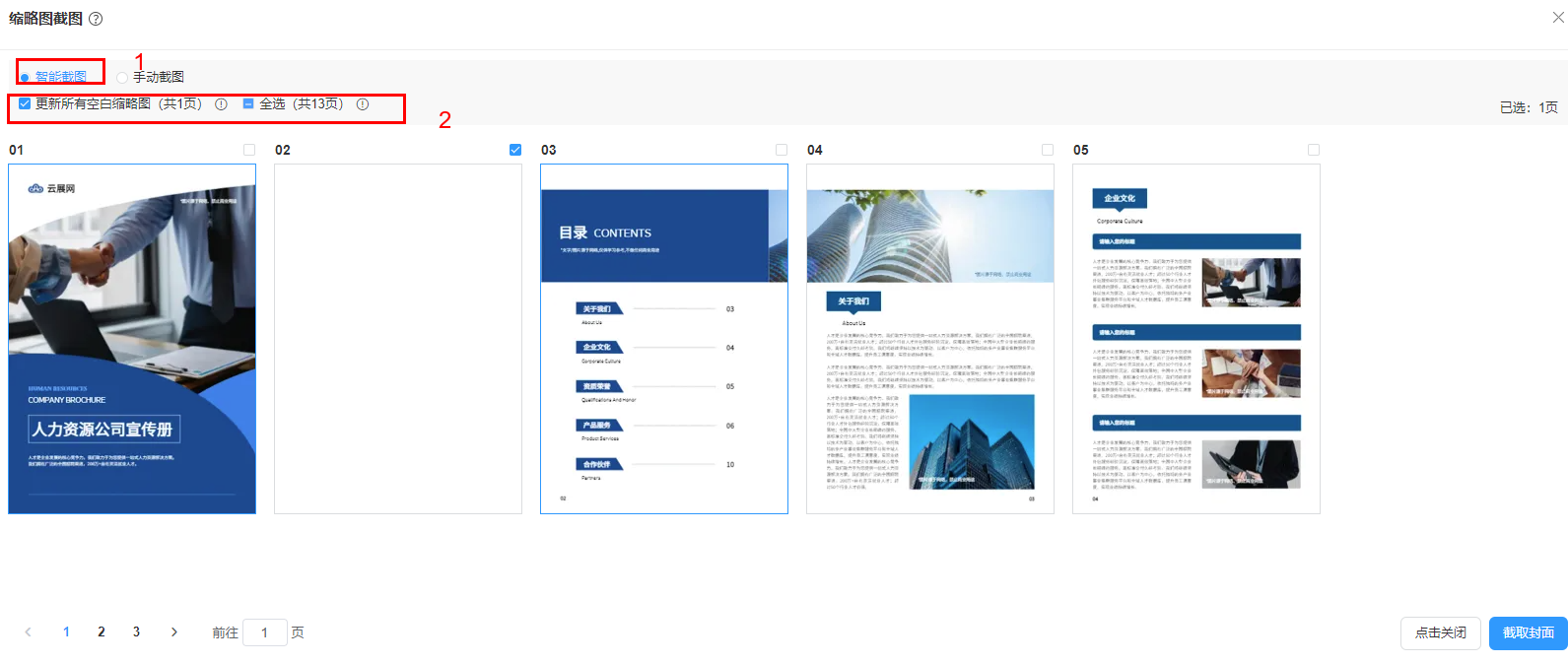 選擇【智能截圖】,勾選你需要截圖的頁面,點(diǎn)擊【截取封面】后,等待生成并截圖完成。