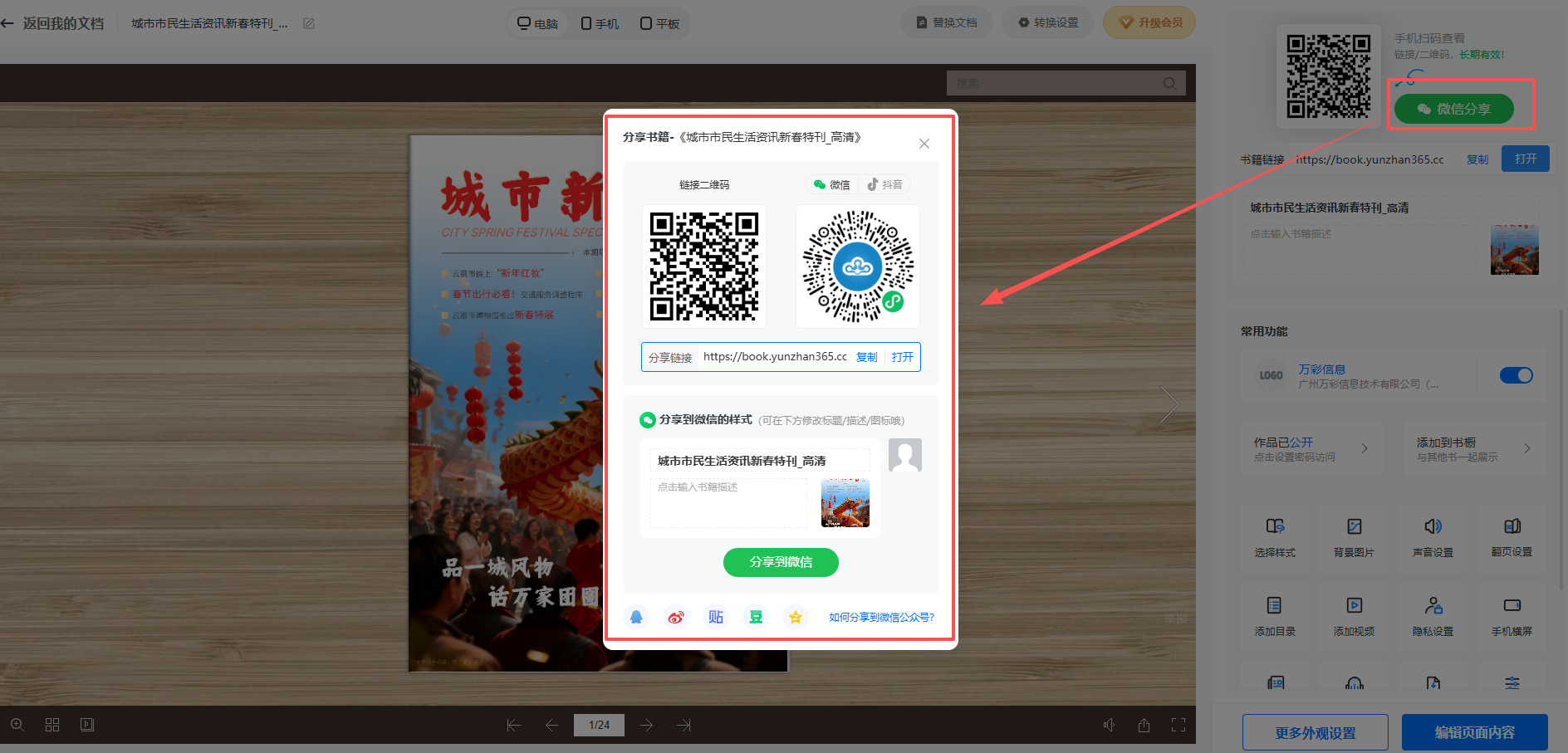 上傳成功以后生成的書(shū)本鏈接以及二維碼可以用于網(wǎng)站,微信(包含朋友圈,好友,微信群,公眾號(hào)),QQ郵箱等發(fā)布。