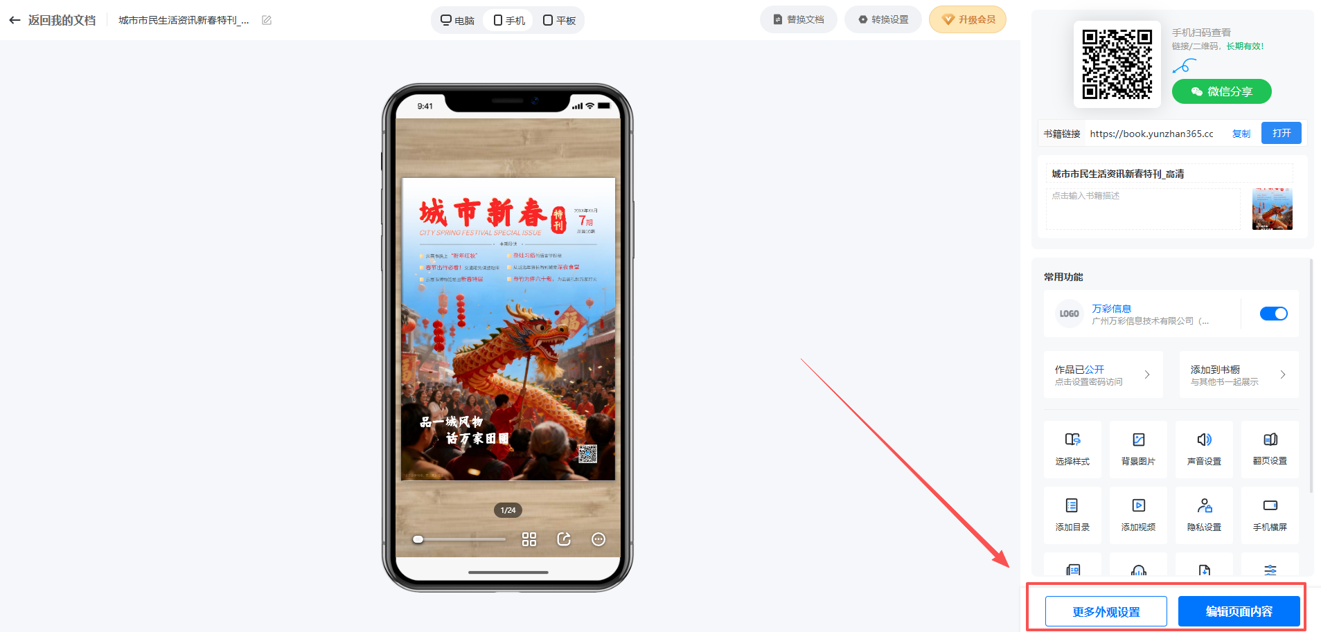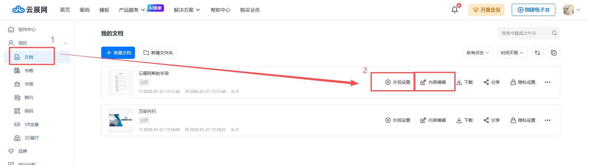 點(diǎn)擊【文檔】,可以找到書(shū)本,點(diǎn)擊【外觀設(shè)置】/【內(nèi)容編輯】按鈕可以繼續(xù)編輯修改。