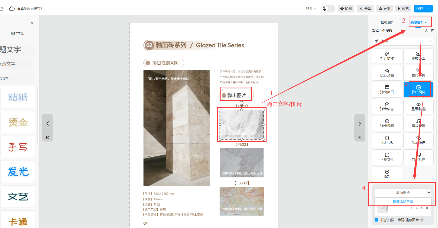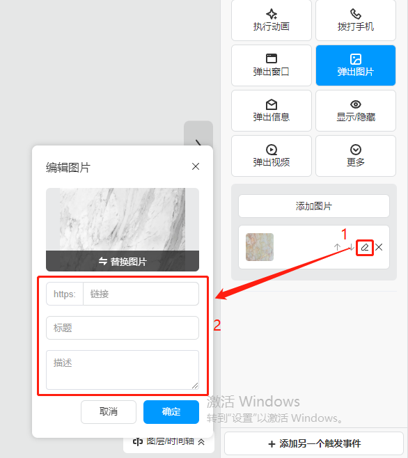 選中需要設(shè)置的文字或者圖片,然后在【觸發(fā)事件】選擇【彈出圖片】點擊添加圖片;如果是選擇圖片設(shè)置彈出大圖,可直接點擊【快速添加本圖】快速添加圖片