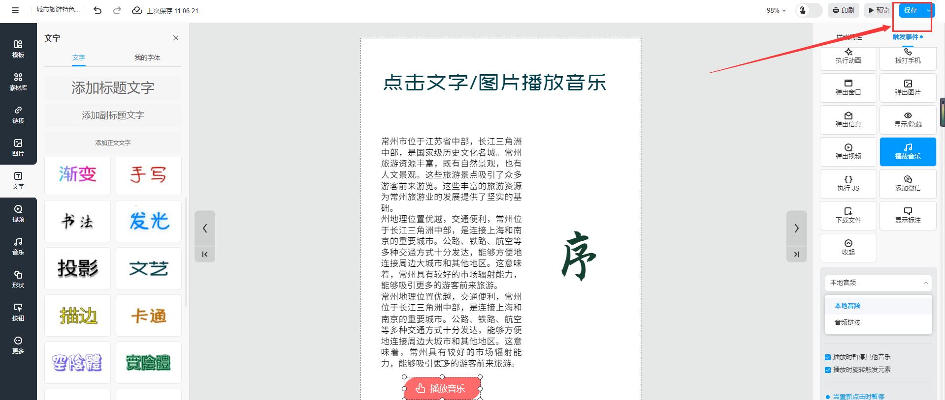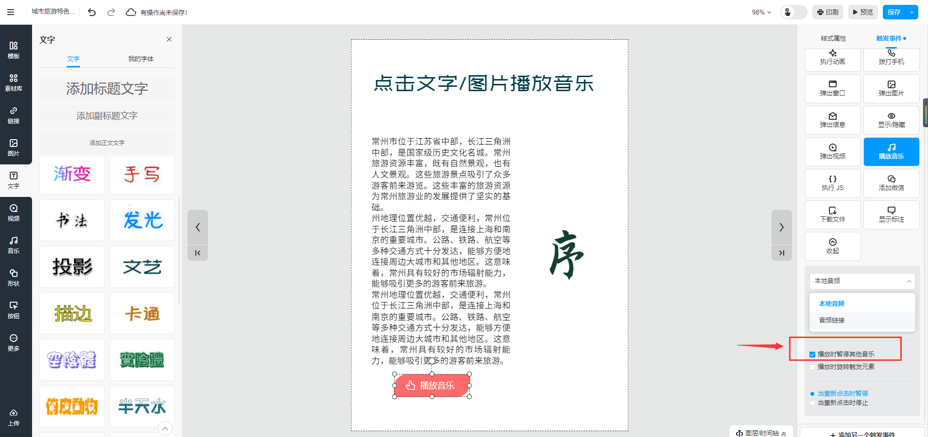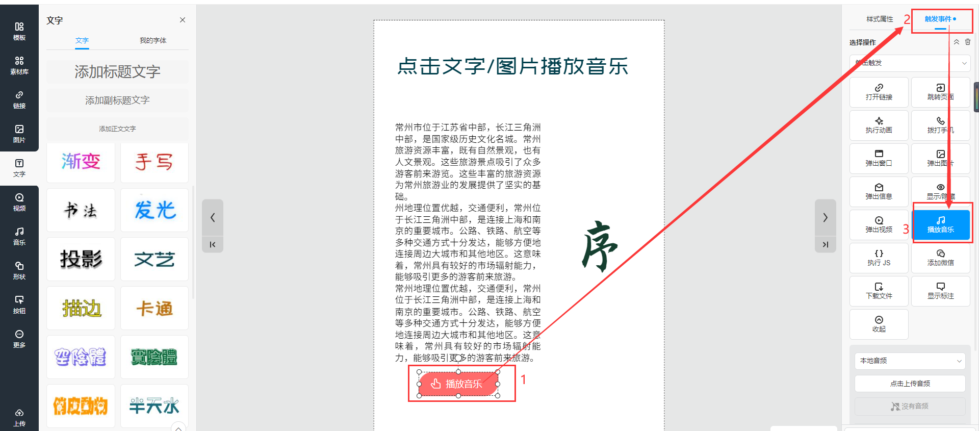 選中需要播放音樂的文字或者圖片,然后點擊【觸發(fā)事件】選擇【播放音樂】